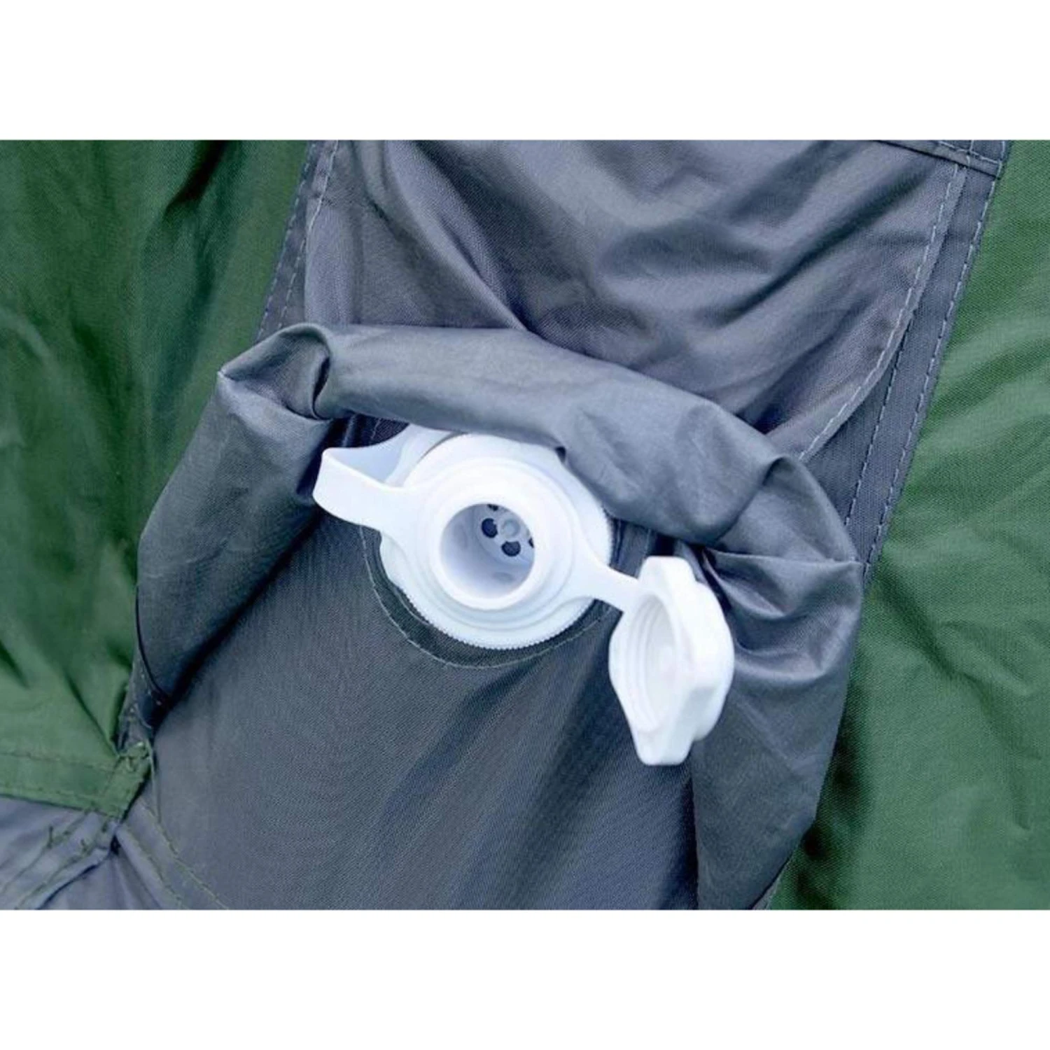 • Die Innenzelttür kann aufgerollt mit einem Knebelverschluss befestigt werden